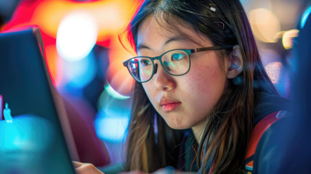The picture of the east asian girl is working as the coding programmer inside the office and blur background, the programmer require skill like coding, logical thinking, patience and debugging. AIG43.