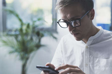 Young white man with a neat beard studying and looking at the phone at his desk