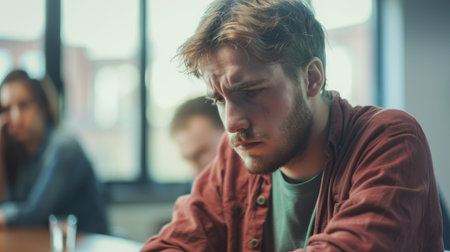 Person with sad expression, looking down, while his colleagues discuss in a meeting room. generative ai
