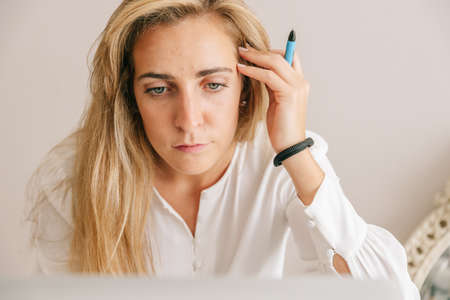 Close-up portrait of serious focused mid adult female freelancer with blond hair looking at laptop while working in home office