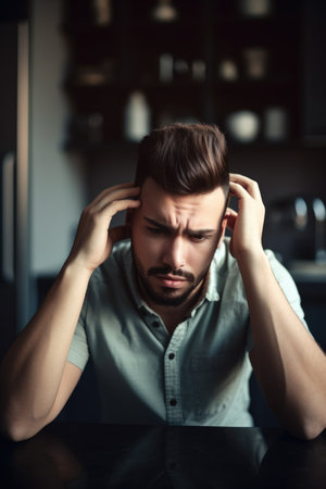 shot of a young man looking stressed at home, created with generative ai