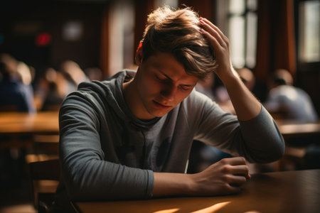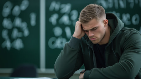 Frustrated student in a classroom setting, sitting at a desk with a hand on his head. Stress and academic challenges