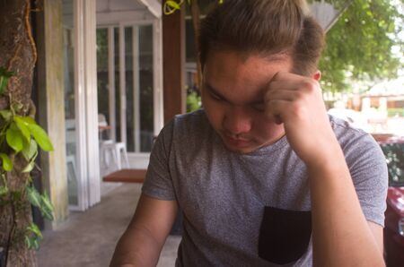 Handsome depressed young man thunking about way of solving his problems