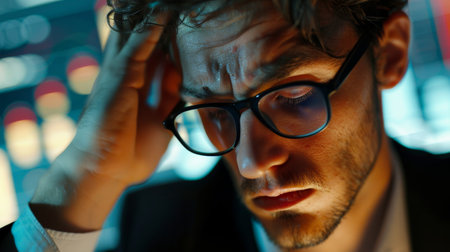 A financial analyst with a look of deep focus and mild stress, meticulously examining complex financial data and charts.