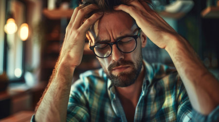 A man with glasses sitting at a table, looking distressed with his head in his hands. He appears deep in thought or troubled by something, as he contemplates silently at the table.