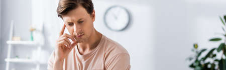 Panoramic orientation of pensive man with hand near cheek looking away at home