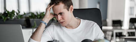 Depressed young businessman holding head in hands, has problem, a laptop on the desk. A guy made a mistake in a work