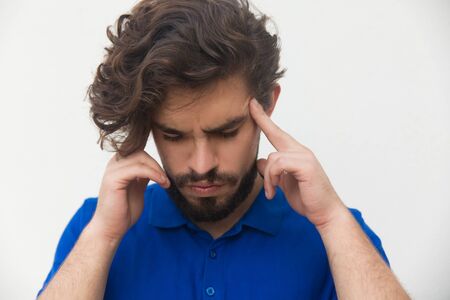 Closeup of focused tired guy touching head, thinking hard or suffering from headache. Handsome bearded young man in blue casual t-shirt posing isolated over white background. Concentration concept