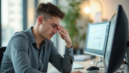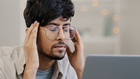 Young man struggles with a headache while working from his home office, battling exhaustion and anxiety. The image reflects mental health challenges in todays fast paced world