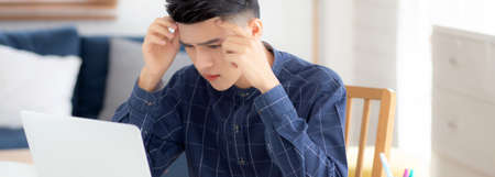 Young asian business man headache during working on laptop computer with deadline on desk at home, businessman with failure exhausted and tired, stress and worried, frustrated and unsuccessful.