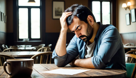 A man sits in a quiet cafe, his expression stressed as he reviews documents, with a coffee cup suggesting long hours of work.. AI Generation