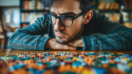 A man with glasses sitting at a table surrounded by legos, AI