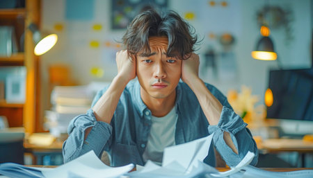 A man is sitting at a desk with his hands on his head, showing signs of stress or being overwhelmed