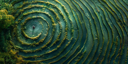 A mesmerizing whirlpool forms on the calm surface of water, creating perfect concentric ripples. The golden reflection of the sunset adds a warm, serene glow to the abstract, fluid motion of the vortex.