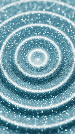 Abstract background featuring concentric circles of sparkling teal blue glitter with bright white highlights and a soft bokeh effect, suggesting ripples or waves.