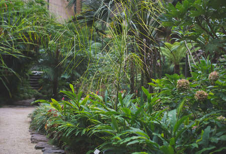 Straight road path goes into a distance into lush jungle fresh green vegetation, branches of palm trees, bushes Tropical garden landscape. Exotic nature in the Royal Botanical Garden of Madrid, Spain.