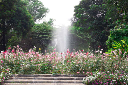 A picturesque garden featuring a grand fountain at its center, surrounded by vibrant flower beds and lush green trees. Ideal for nature lovers.