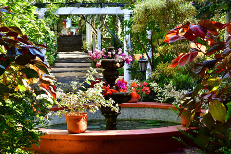 Colorful flowers in pots in the courtyard of a villa.
