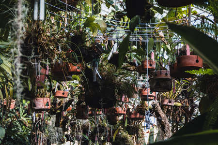 Greenhouse with plants hanging from the ceiling and lots of vegetation. Copyspace. Selective focus.