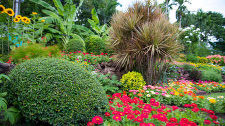 A pathway in spring garden in a shadow of green trees. Trimmed bushes and blooming flowers. Tropical landscape. Botanical park nature in daytime.