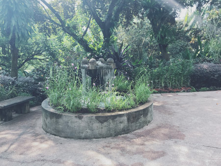 Small fountain in the garden with green plants and trees in the background.