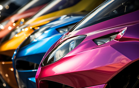 Cars for sale, vehicle or lot for dealership salon in parking or line up. Colorful, model or display
