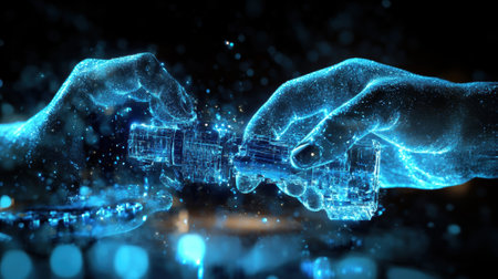A close up of a hand connecting glowing nodes in a network, symbolizing technology, innovation, and connectivity in a digital world