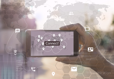 Connectivity concept. Woman holding generic design smartphone. Touching screen smartphone. Worldwide connection illustrative interface