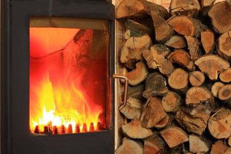 Burning firewood in a fireplace close-up. Firewood burns in the stove, view through an open door.