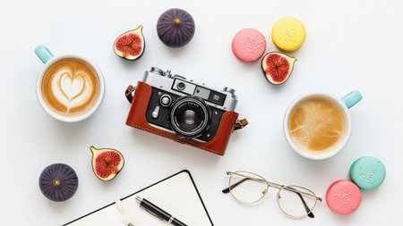 Creative flat lay top view photo of cup of coffee, camera, colorful macaroons and fresh figs on white background copy space minimal style.