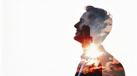 A man is silhouetted against a city skyline with a sun in the background. Concept of loneliness and isolation, as the man stands alone in the midst of the bustling city