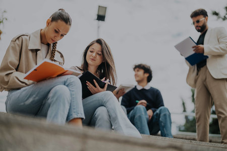 High school students collaborate on homework projects outdoors together