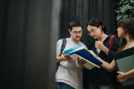 Enthusiastic group of friendly students standing together with notebooks and folders, exuding joy as they celebrate their academic journey and the