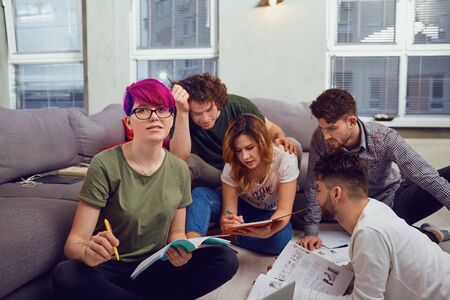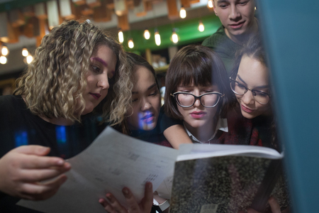 Group of teenagers doing homework in cafe.