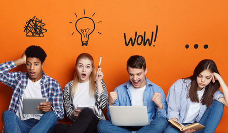 Emotional and thoughtful students with gadgets and books over orange background