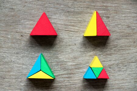 Triangle wood block arranging can use for business template or bullet or infographic. Wood block on white background.