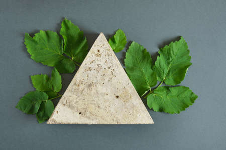 mint branches and leaves on a triangular stone, dark green background, advertising your product, organic natural product with mint oil, concrete podium in the shape of a triangle