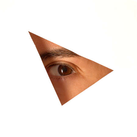 Black triangle made of crumpled paper on a white background. Abstract art background.