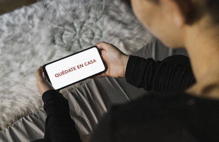 Stay at home. Hands of a young woman holding a mobile phone with a blank screen to put a text message or advertising content, with a vintage room background. Social distance. Coronavirus devices. Social distancing. Protection against pandemics