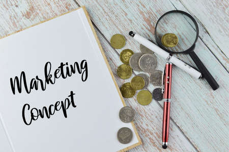 Top view of magnifying glass, pens and notebook written with MARKETING CONCEPT