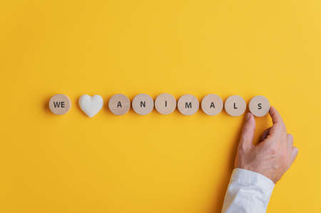 We love animals sign spelled on wooden cut circles with heart shape marble in the middle. Over yellow background.