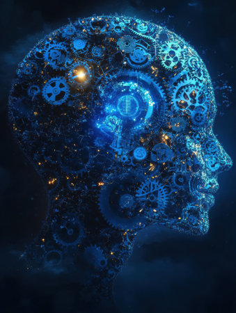 A head shape is filled with intricate gears and cogs, representing the concept of artificial intelligence.