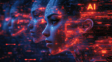 This striking image depicts the merging of a human face and robot features, exploring themes of technology, connection, and the future of artificial intelligence.