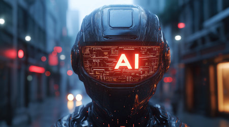 Stylized human head integrated with circuit boards and glowing red light suggesting AI use for technology concepts or future themed designs.
