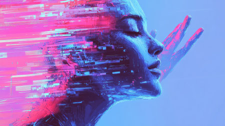 Glitch effect creates a distorted portrait with vibrant colors and sharp contrasts