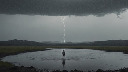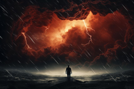 Person standing alone in a dramatic stormy landscape, surrounded by swirling clouds and striking lightning, evoking power and awe.