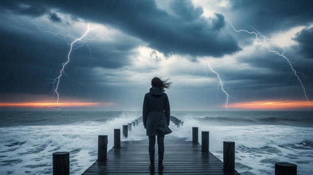 A solitary figure stands on a wooden pier, gazing out at the tumultuous sea under a dramatic sky filled with dark clouds and striking lightning. The waves crash against the pier as the person, dressed in a coat, appears to contemplate the raw power of nature.