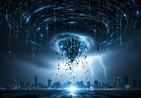Futuristic cityscape under a powerful digital storm. A swirling vortex of binary code and glowing lines descends, showering data onto illuminated buildings.