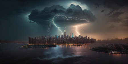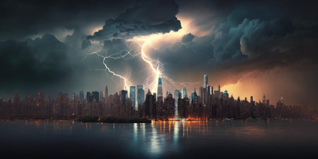 Destructive and powerful thunder storm strike metropolis city with thunderbolt. superlative generative AI image.