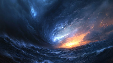 Raging ocean vortex amidst dark thunderous clouds at sea.